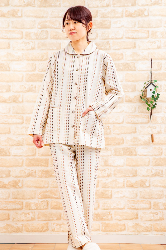 パジャマ レデイース 秋冬 肌にやさしい綿100%先染めドット織ストライプ地 前開き M/L/LL 入院準備 ナイトウェア ルームウェア